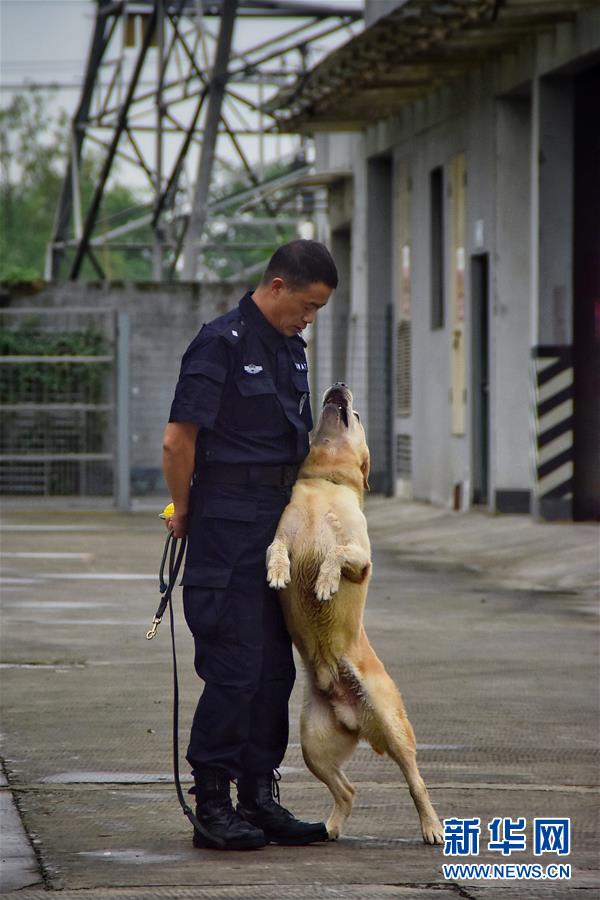 6月24日,緝毒犬“多多”完成訓(xùn)練后,與訓(xùn)導(dǎo)員周吉榮親密互動(dòng)。 新華社記者 鄭夢(mèng)雨 攝