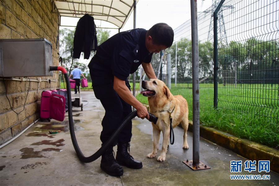 6月24日,緝毒犬“多多”洗澡后,訓(xùn)導(dǎo)員周吉榮將其毛發(fā)吹干。 新華社記者 鄭夢(mèng)雨 攝