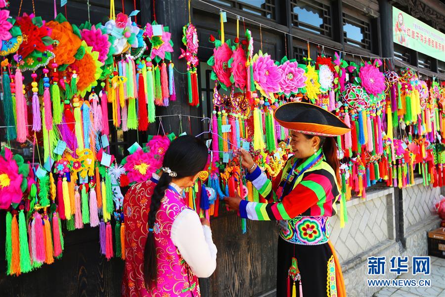 6月24日,繡娘在青海省互助土族自治縣舉辦的端午節(jié)香包“選美”大賽上交流。新華社記者解統(tǒng)強(qiáng)攝