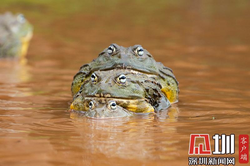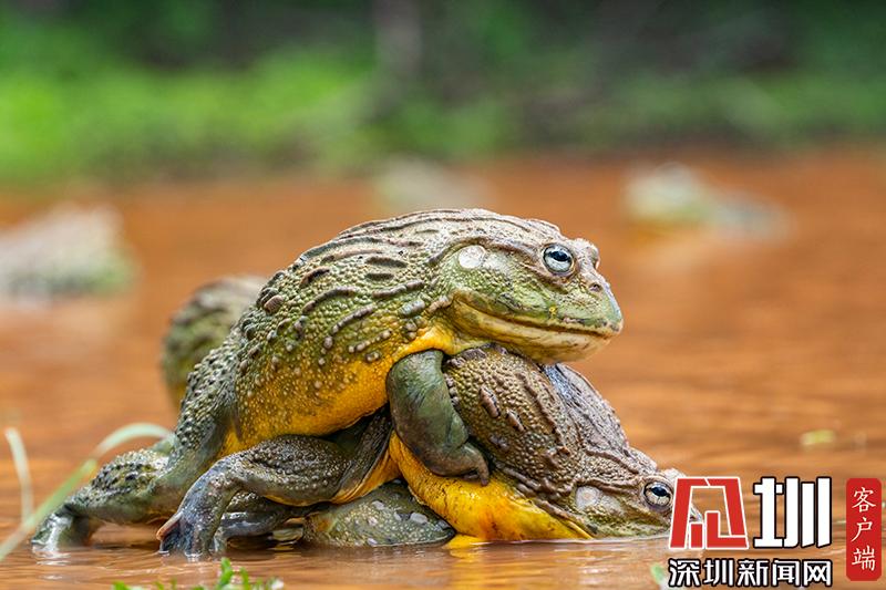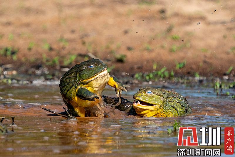 2020年6月30日?qǐng)?bào)道(具體拍攝時(shí)間不詳),南非波羅克瓦克,兩只雄性非洲牛蛙為了爭(zhēng)奪雌性牛蛙,在池塘中打架,這樣的情形十分罕見(jiàn)。畫面中,戰(zhàn)況十分激烈,一只非洲牛蛙在另外一只試圖逃到池塘邊緣時(shí)撕咬對(duì)手,甚至將另外一只拋向空中。這些精彩的照片是由南非開(kāi)普敦?cái)z影師Temujin Johnson拍攝的。