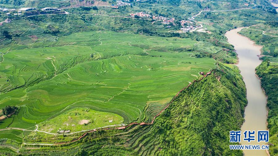 貴州省盤州市新民鎮(zhèn)的梯田風(fēng)光(6月29日攝,無人機照片)。夏日時節(jié),貴州省盤州市新民鎮(zhèn)的梯田風(fēng)景如畫。新華社記者陶亮攝