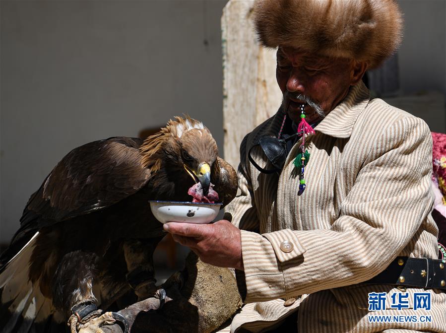 6月29日,庫爾馬西·胡特曼在家中給獵鷹喂食鮮羊肉。新華社記者宋彥樺攝