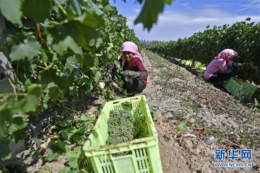 寧夏銀川市永寧縣閩寧鎮(zhèn)原隆村立蘭釀酒葡萄種植基地,農戶在田間采摘葡萄(2019年9月3日攝)。新華社記者王鵬攝