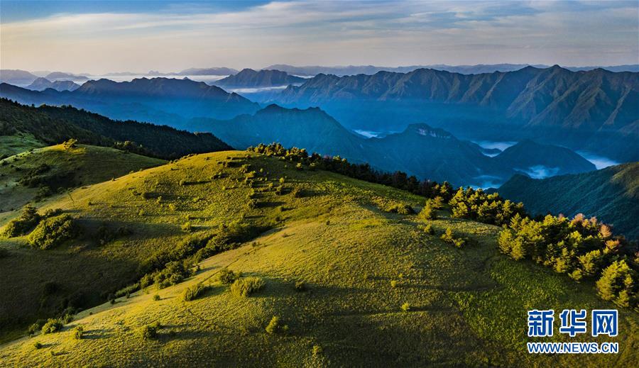 6月30日,朝霞照耀下的神田草甸(無人機(jī)照片)。位于陜西省安康市嵐皋縣與重慶市城口縣交界處大巴山神田主脊北坡的神田草甸,面積超過1.1萬畝。夏日的朝霞中,起伏的草甸仿佛一塊寬大無邊的綠色地毯,鑲嵌在大巴山上,如詩如畫。新華社記者陶明攝