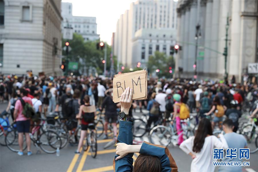 6月30日,一名抗議者在美國(guó)紐約市政廳附近手舉寫(xiě)有“黑人的命也是命”縮寫(xiě)的標(biāo)語(yǔ)參加抗議活動(dòng)。由美國(guó)明尼蘇達(dá)州明尼阿波利斯市非裔男子弗洛伊德遭白人警察暴力執(zhí)法而死一事引發(fā)的各種抗議活動(dòng)仍在紐約持續(xù)進(jìn)行。新華社記者王迎攝