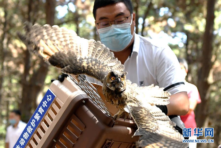 7月1日,吉林省野生動(dòng)物救護(hù)繁育中心工作人員放飛一只長(zhǎng)耳鸮。當(dāng)日,吉林省東北虎園舉行放飛活動(dòng),吉林省野生動(dòng)物救護(hù)繁育中心救護(hù)的40只珍稀野生鳥(niǎo)類成功放歸自然。新華社記者林宏攝