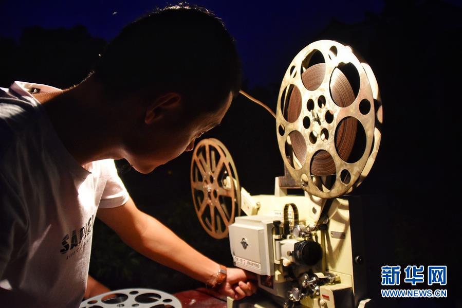 6月30日晚,電影放映中,朱強(qiáng)在更換膠片。新華社記者鄭夢雨攝