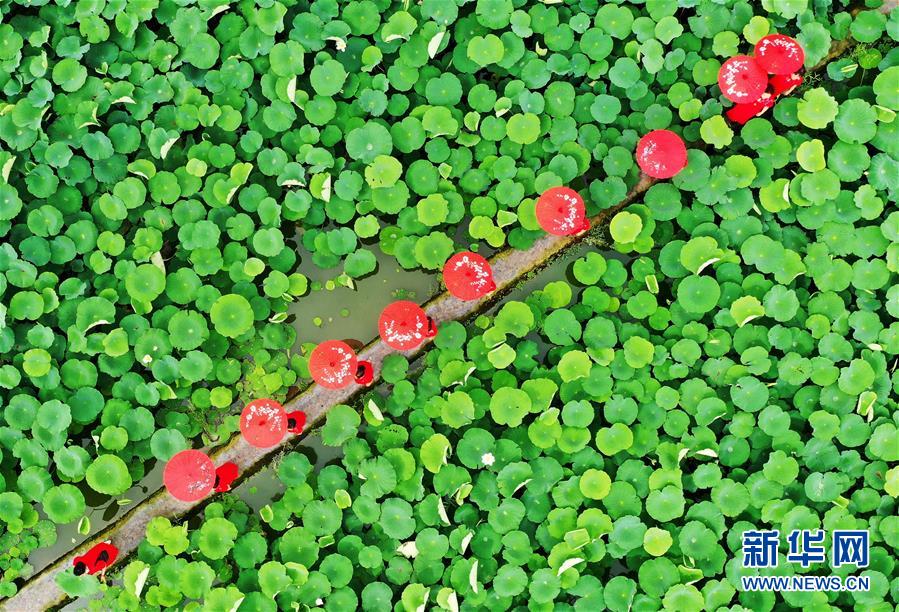 7月3日,游客在曲周縣勝豐蓮藕種植專業(yè)合作社荷塘景區(qū)游覽(無人機(jī)照片)。時值夏日,河北省曲周縣勝豐蓮藕種植專業(yè)合作社荷塘景區(qū)的荷花競相綻放,吸引眾多游人前來觀光游覽。新華社記者 王曉 攝