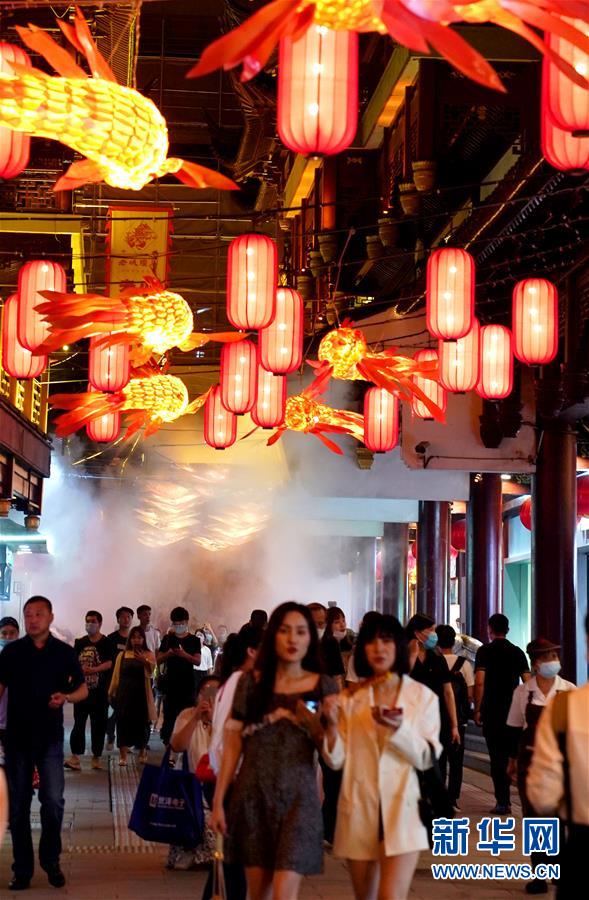 7月3日在上海豫園拍攝的燈景。從7月第一個(gè)周末起,上海豫園原有的“豫園六點(diǎn)半”集市全面升級(jí),煥彩燈光、演藝活動(dòng)和花車集市全線更新,讓市民和游客在觀燈、觀人、觀演的沉浸式體驗(yàn)中,享受夏日特色的“食玩”樂趣。新華社記者 劉穎 攝