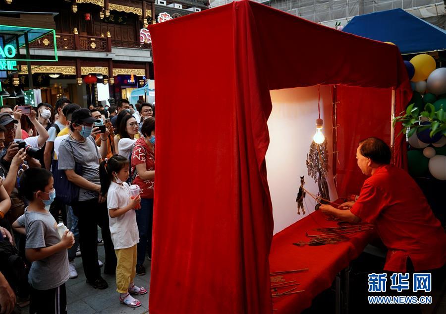 7月3日,游人在上海豫園中心廣場上觀看皮影表演。從7月第一個周末起,上海豫園原有的“豫園六點半”集市全面升級,煥彩燈光、演藝活動和花車集市全線更新,讓市民和游客在觀燈、觀人、觀演的沉浸式體驗中,享受夏日特色的“食玩”樂趣。新華社記者 劉穎 攝