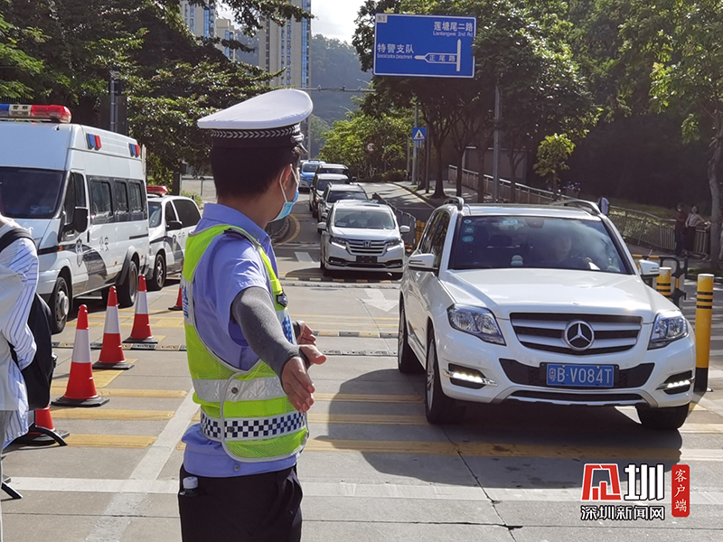 紅嶺中學(xué)考點門口正在指揮車輛通行的交警。