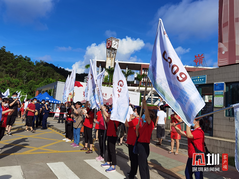 考生學(xué)長來到深圳紅嶺中學(xué)考點門口為學(xué)弟舉起“奧利給”的旗子。