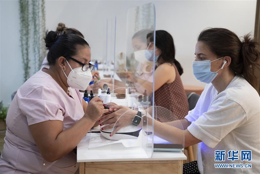 7月6日,技師在美國(guó)紐約一家美甲店為顧客美甲。當(dāng)天,紐約進(jìn)入重啟第三階段,美甲店、按摩店等個(gè)人護(hù)理業(yè)在經(jīng)歷近4個(gè)月的停業(yè)后被允許重新開(kāi)放。因防疫需要,原本應(yīng)在第三階段開(kāi)放的餐飲業(yè)室內(nèi)就餐仍處于暫停狀態(tài)。新華社記者王迎攝