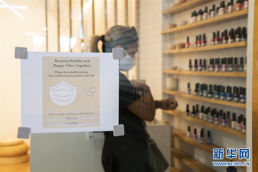 7月6日,顧客在美國(guó)紐約一家美甲店挑選指甲油,店門(mén)上貼著佩戴口罩進(jìn)店的提示。當(dāng)天,紐約進(jìn)入重啟第三階段,美甲店、按摩店等個(gè)人護(hù)理業(yè)在經(jīng)歷近4個(gè)月的停業(yè)后被允許重新開(kāi)放。因防疫需要,原本應(yīng)在第三階段開(kāi)放的餐飲業(yè)室內(nèi)就餐仍處于暫停狀態(tài)。新華社記者王迎攝