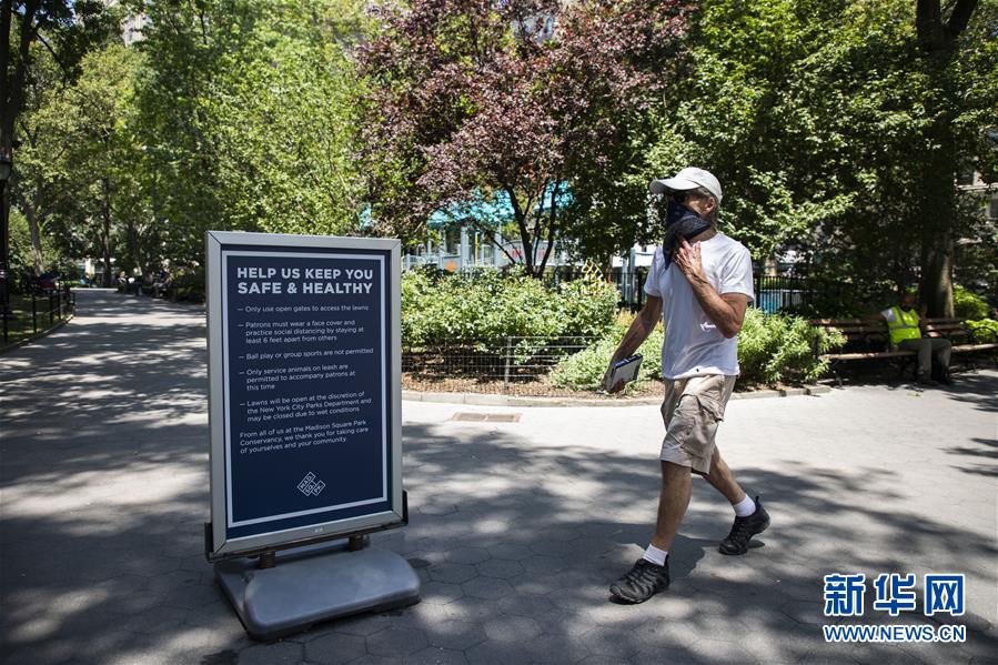 7月6日,行人走過美國紐約一處公園內(nèi)的提示牌,上面寫有防疫須知和公園管理規(guī)定。