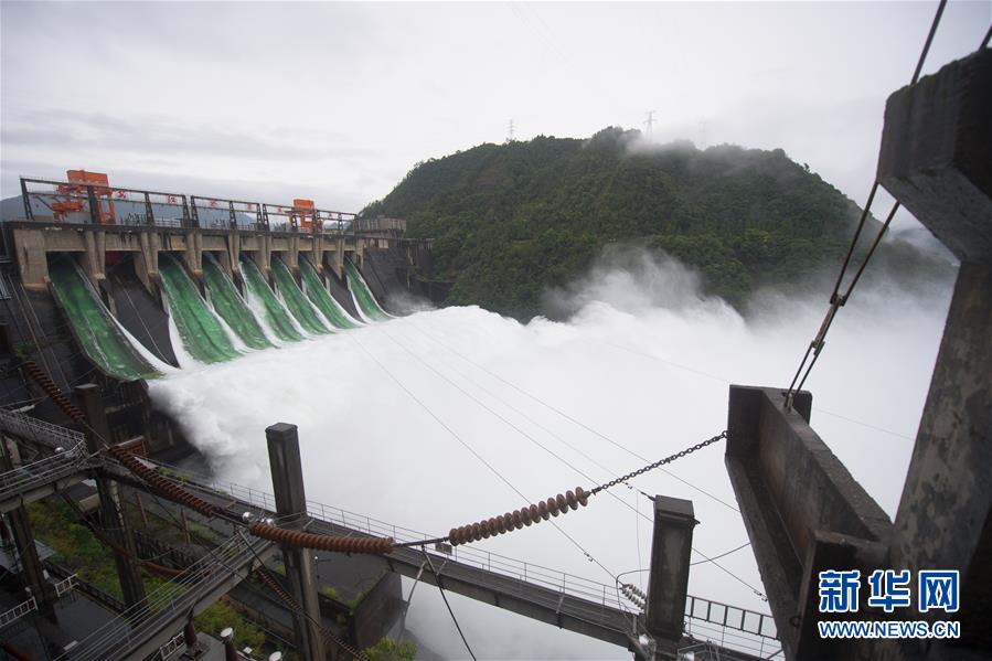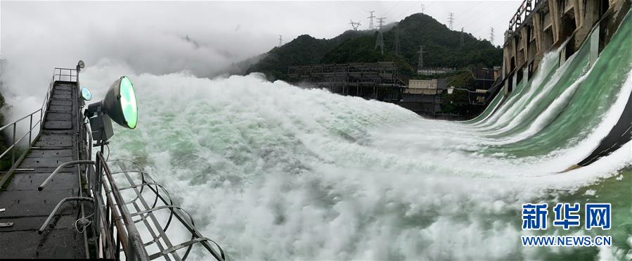 7月7日下午開啟7孔泄洪的新安江水庫(kù)(手機(jī)全景模式拍攝)。受持續(xù)降水影響,浙江新安江水庫(kù)水位持續(xù)快速上升。繼當(dāng)日10時(shí)開啟3孔、12時(shí)開啟5孔泄洪后,新安江水庫(kù)于16時(shí)增加到7孔泄洪。新安江水庫(kù)是華東地區(qū)最大的水庫(kù),在錢塘江流域的防洪度汛中起到關(guān)鍵作用。新華社記者翁忻旸攝