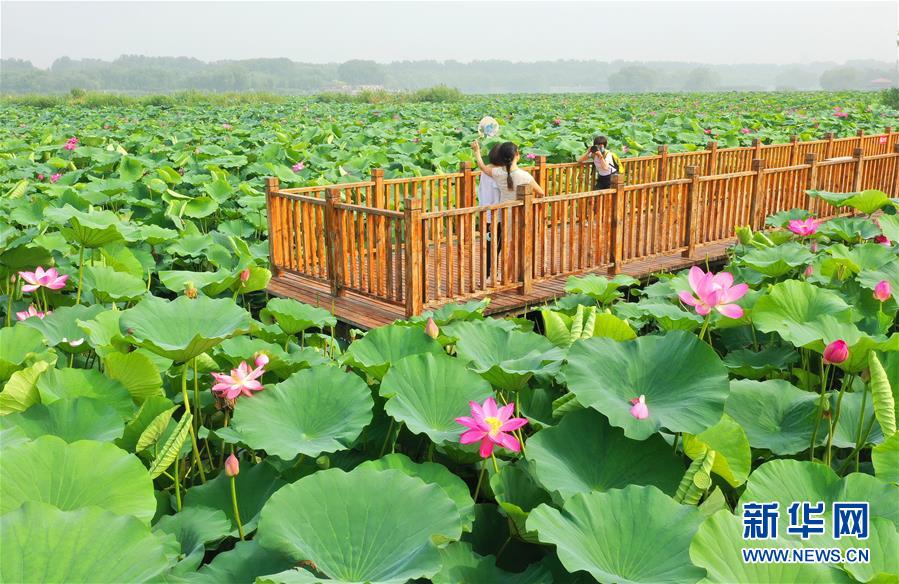 7月7日,游客在唐山市南湖公園的觀荷棧橋上拍照(無(wú)人機(jī)照片)。近日,河北省唐山市南湖公園內(nèi)荷花競(jìng)相綻放,呈現(xiàn)出“接天蓮葉無(wú)窮碧,映日荷花別樣紅”的美麗景象,吸引了眾多游客前來(lái)觀賞。新華社記者楊世堯攝