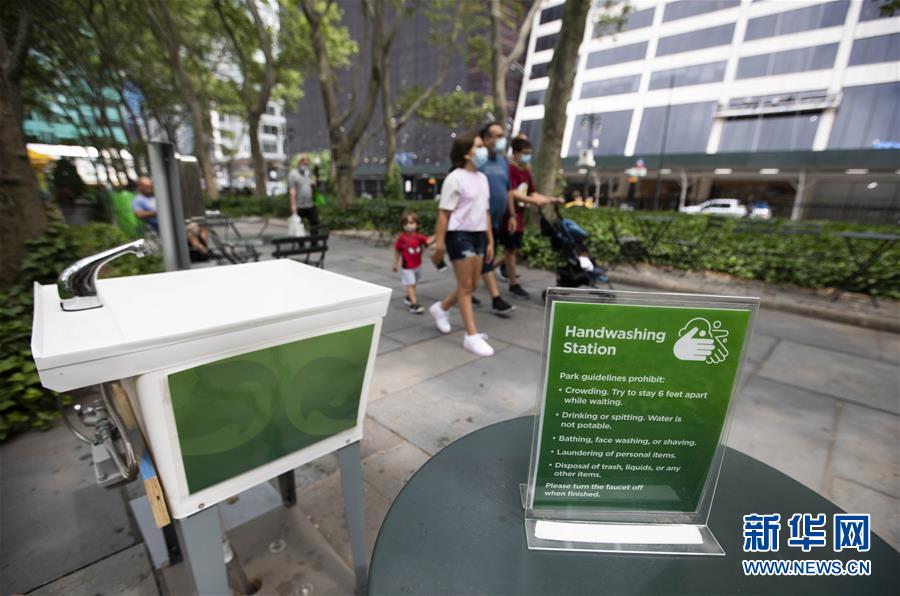 7月8日,行人從美國紐約布萊恩特公園的洗手設施旁經(jīng)過。美國約翰斯·霍普金斯大學8日發(fā)布的新冠疫情最新統(tǒng)計數(shù)據(jù)顯示,美國累計確診病例超過300萬例。數(shù)據(jù)顯示,截至美國東部時間8日11時34分(北京時間23時34分),美國累計確診病例3016515例,累計死亡病例131594例。新華社記者王迎攝