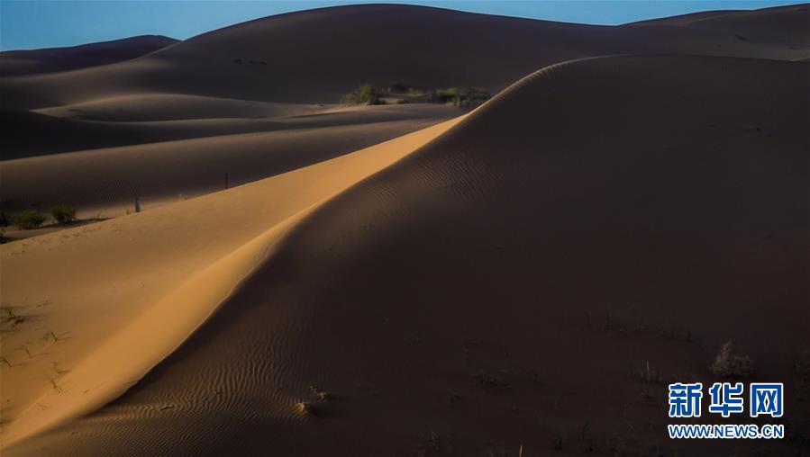 這是7月8日拍攝的騰格里沙漠風光。位于內蒙古自治區(qū)阿拉善左旗西南部和甘肅省中部邊境的騰格里沙漠是我國第四大沙漠,總面積約為4.3萬平方公里。夏日傍晚,騰格里沙漠連綿的沙丘被日光勾勒出美麗的線條,美不勝收。新華社記者連振攝