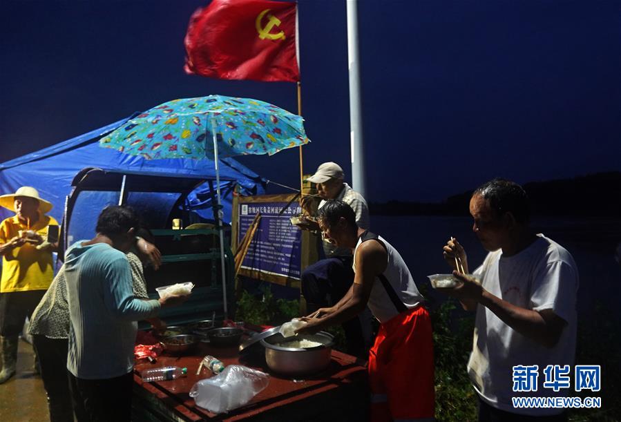 7月9日,邵忠如(右二)和村民一起在圩堤上冒雨吃晚飯。新華社記者萬象攝