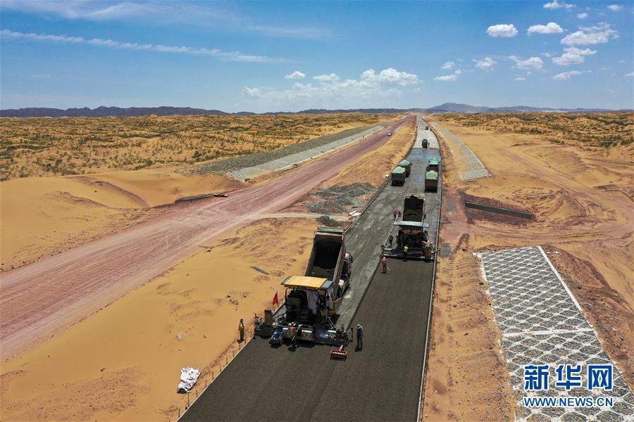 7月10日,位于寧夏境內(nèi)的烏瑪高速青銅峽至中衛(wèi)段A10標(biāo)段在施工中(無(wú)人機(jī)照片)。盛夏時(shí)節(jié),位于寧夏境內(nèi)的烏瑪(內(nèi)蒙古烏海市至青?,斍呖h)高速青銅峽至中衛(wèi)段正在抓緊施工建設(shè)。該路段主線全長(zhǎng)122.9公里,其中穿越騰格里沙漠腹地的18公里公路是寧夏建設(shè)的首條沙漠高速公路,預(yù)計(jì)2021年建成通車。新華社記者馮開(kāi)華攝。