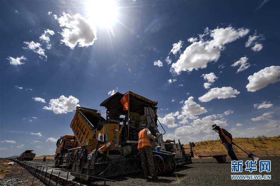 7月10日,工人在位于寧夏境內(nèi)的烏瑪高速青銅峽至中衛(wèi)段A10標(biāo)段施工。盛夏時節(jié),位于寧夏境內(nèi)的烏瑪(內(nèi)蒙古烏海市至青海瑪沁縣)高速青銅峽至中衛(wèi)段正在抓緊施工建設(shè)。該路段主線全長122.9公里,其中穿越騰格里沙漠腹地的18公里公路是寧夏建設(shè)的首條沙漠高速公路,預(yù)計2021年建成通車。新華社記者馮開華攝。
