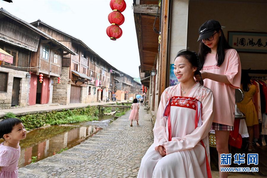 7月4日,游客蘇夢(右二)在浦源村一家漢服租賃店體驗漢服文化,她的女兒在一旁好奇地觀看。新華社記者 姜克紅 攝