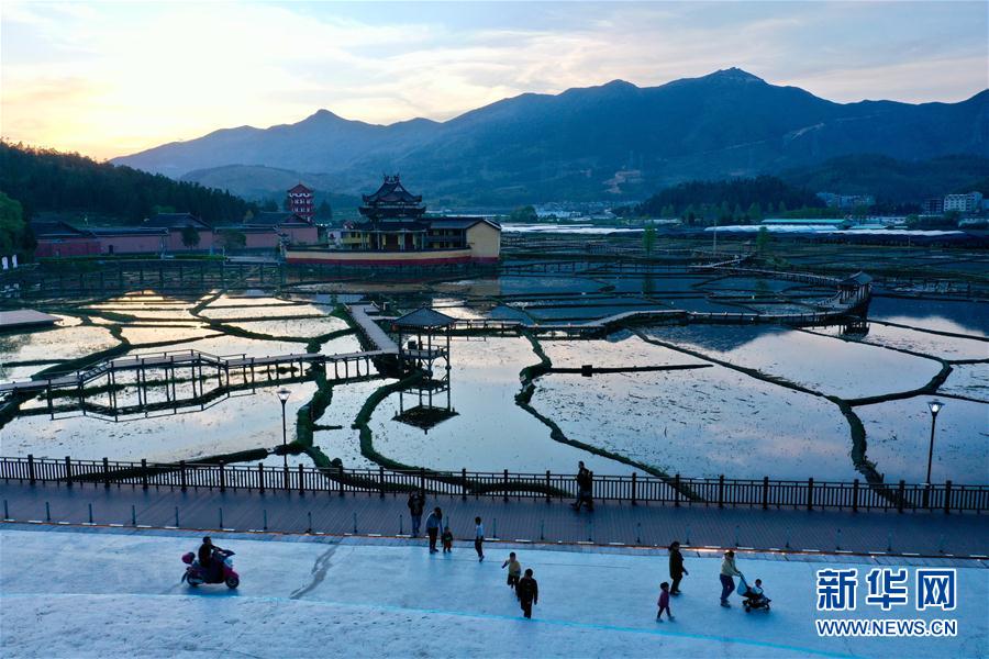 4月17日傍晚時(shí)分,人們?cè)谄衷创艴庺~溪公園散步休閑(無人機(jī)照片)。新華社記者 姜克紅 攝