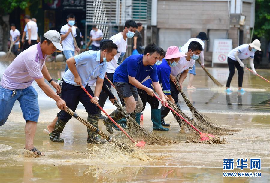7月12日,融水苗族自治縣文化體育廣電和旅游局清淤小分隊(duì)在蘆笙廣場(chǎng)清理地面。當(dāng)日,在廣西柳州市融水苗族自治縣,融江洪水退去,當(dāng)?shù)叵嚓P(guān)部門組織多支清淤排險(xiǎn)小分隊(duì),積極開展災(zāi)后恢復(fù)工作。新華社記者 黃孝邦 攝