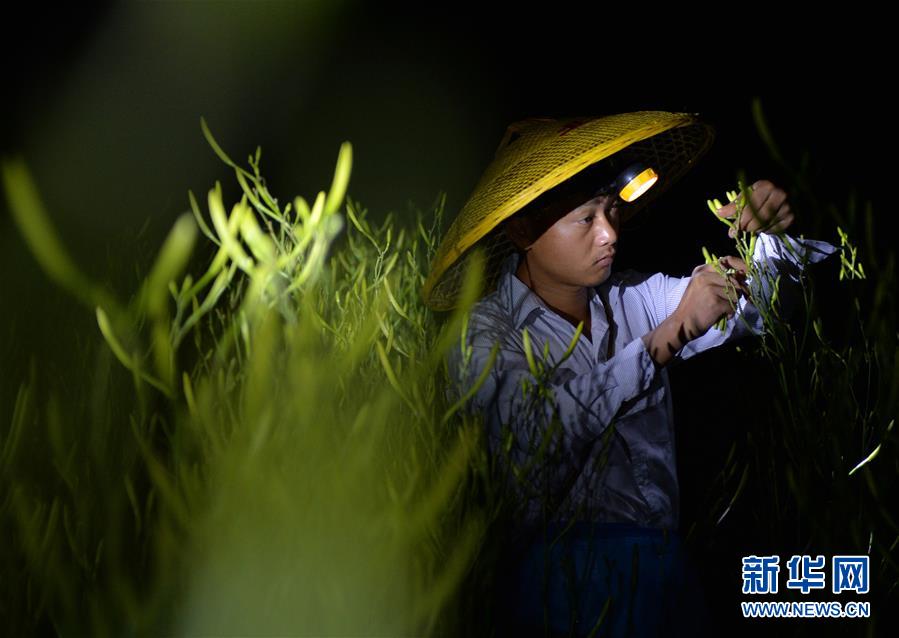 7月12日凌晨,祁東縣官家嘴鎮(zhèn)草源沖村,一名菜農戴著頭燈采摘黃花菜。