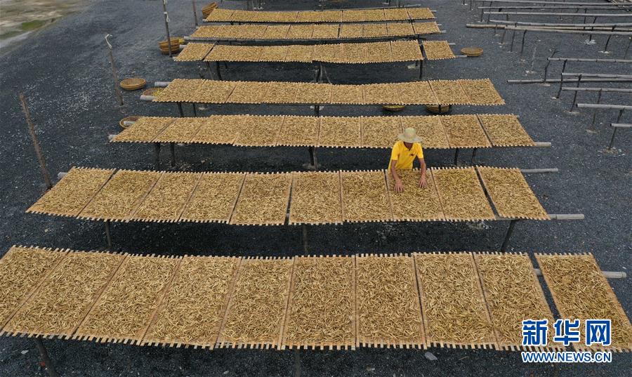 7月12日,祁東縣黃土鋪鎮(zhèn)雷公殿村,村民在晾曬黃花菜(無(wú)人機(jī)照片)。新華社記者 趙眾志 攝