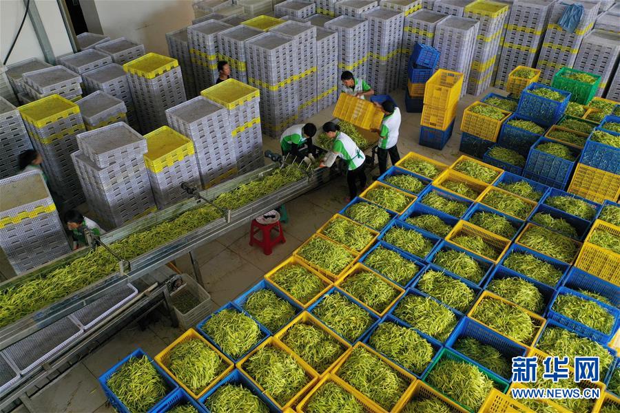 7月12日,祁東縣黃土鋪鎮(zhèn)雁隆食品公司內(nèi),工人通過傳送帶運送黃花菜準備加工(無人機照片)。新華社記者 趙眾志 攝