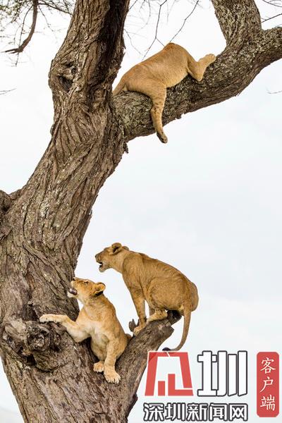 攝影師抓拍獅子上樹畫面 為爭奪位置憤怒咆哮互相攻擊