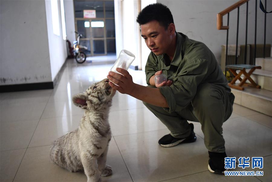 7月13日,動物園工作人員許家興給“妞妞”喂水。河北石家莊市動物園的孟加拉白虎寶寶“妞妞”只有3個月大,由于虎媽媽經(jīng)驗不足,“妞妞”一出生便由動物園工作人員按科學方法人工飼養(yǎng)。目前,在飼養(yǎng)員的精心照料下,“妞妞”正在茁壯成長。新華社記者 王曉 攝