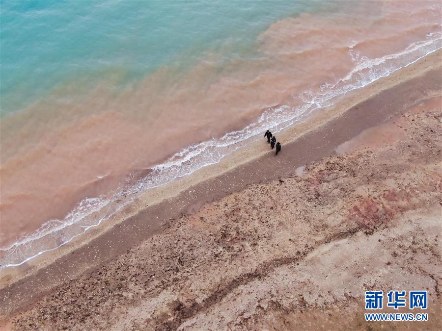 在可可西里索南達(dá)杰保護(hù)站管護(hù)區(qū)域內(nèi)的湖泊附近,龍周才加(中)與隊(duì)友才仁多杰(左)、王文豪在巡視(6月30日攝,無人機(jī)照片)。新華社記者 張龍 攝