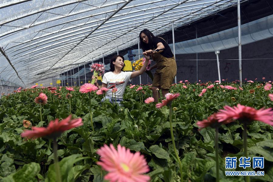 7月10日,在莒縣招賢鎮(zhèn)西黃埠村盛世花卉種植專業(yè)合作社,駐村第一書記鐘翠娟(左)在扶郎花種植大棚進行網(wǎng)上直播。山東省日照市莒縣招賢鎮(zhèn)有20余年的玫瑰花、扶郎花種植歷史。目前,招賢鎮(zhèn)投資建設(shè)的高標(biāo)準(zhǔn)特色鮮花種植大棚可年產(chǎn)700-800萬枝優(yōu)質(zhì)玫瑰和扶郎花等,帶動周邊鄉(xiāng)鎮(zhèn)的建檔立卡貧困戶脫貧增收。新華社記者 范長國 攝