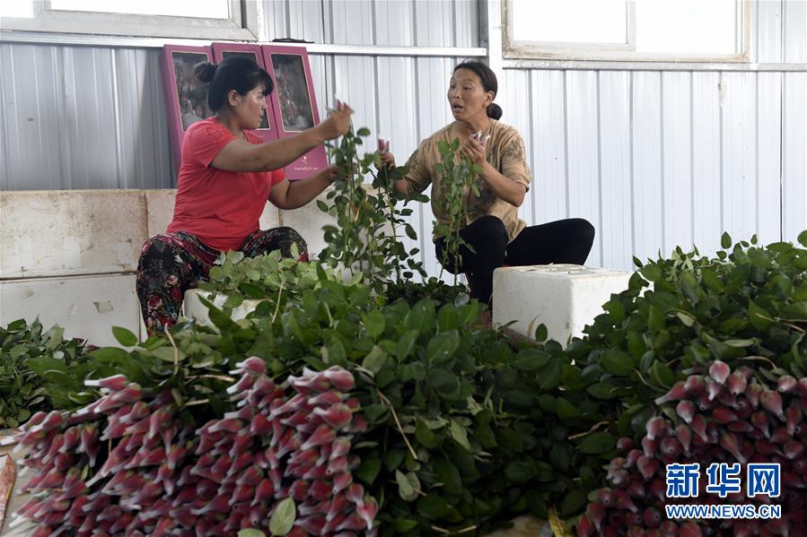 7月10日,莒縣招賢鎮(zhèn)西黃埠村盛世花卉種植專業(yè)合作社工人在包裝玫瑰花。山東省日照市莒縣招賢鎮(zhèn)有20余年的玫瑰花、扶郎花種植歷史。目前,招賢鎮(zhèn)投資建設(shè)的高標(biāo)準(zhǔn)特色鮮花種植大棚可年產(chǎn)700-800萬枝優(yōu)質(zhì)玫瑰和扶郎花等,帶動周邊鄉(xiāng)鎮(zhèn)的建檔立卡貧困戶脫貧增收。新華社記者 范長國 攝