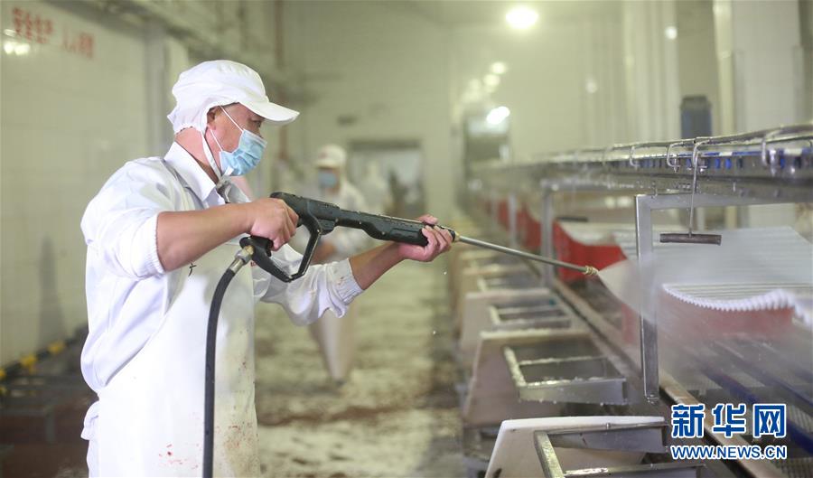 7月14日,北京二商肉類食品集團有限公司員工對肉類分割流水線進行清洗消毒。北京二商肉類食品集團有限公司是保障北京肉類市場供應(yīng)的主要企業(yè)之一。新冠肺炎疫情以來,企業(yè)嚴格實施北京市、農(nóng)業(yè)農(nóng)村部和中國肉類協(xié)會的防疫要求,對進入廠區(qū)的人員、車輛以及原料采購、屠宰分割、產(chǎn)品加工、貯藏運輸、廢棄物收集及污水處理等生產(chǎn)環(huán)節(jié)嚴格防疫,強調(diào)源頭把關(guān)徹底消毒。目前,集團公司下屬多家生豬屠宰加工基地正常運營,保質(zhì)保量供應(yīng)北京市場需求。新華社記者 李欣 攝