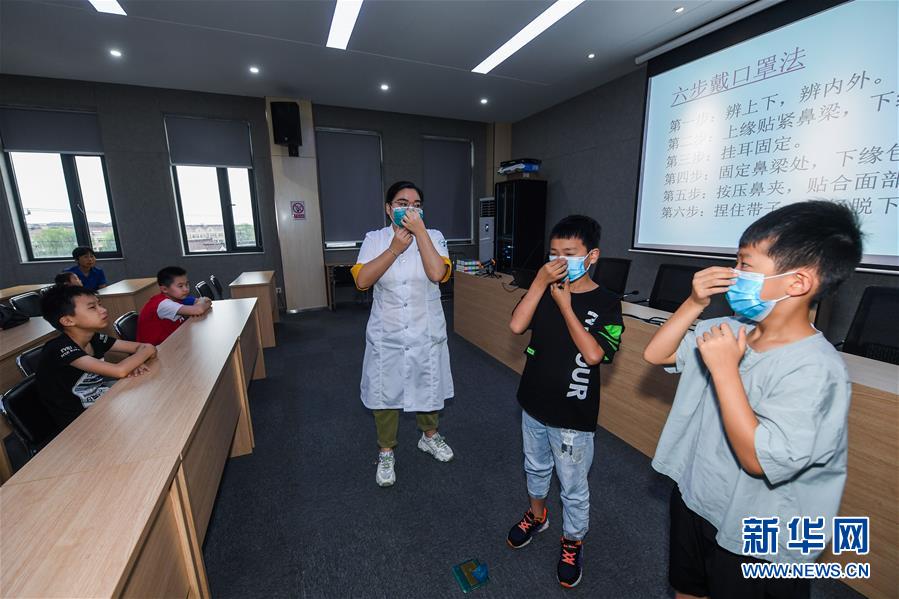 7月16日,小學(xué)生在東林鎮(zhèn)衛(wèi)生院醫(yī)護人員的示范和講解下學(xué)習(xí)正確佩戴口罩。當日,浙江省湖州市吳興區(qū)東林鎮(zhèn)舉辦暑期“安全防護小超人”主題活動。活動由醫(yī)護人員、消防隊員等為學(xué)生及家長講授日常安全避險及溺水急救知識,中小學(xué)們還在現(xiàn)場學(xué)習(xí)了簡易包扎、心肺復(fù)蘇的正確方式,并了解滅火器、滅火毯等消防器材的使用,為學(xué)生平安過暑期打好安全防護“預(yù)防針”。新華社記者 徐昱 攝