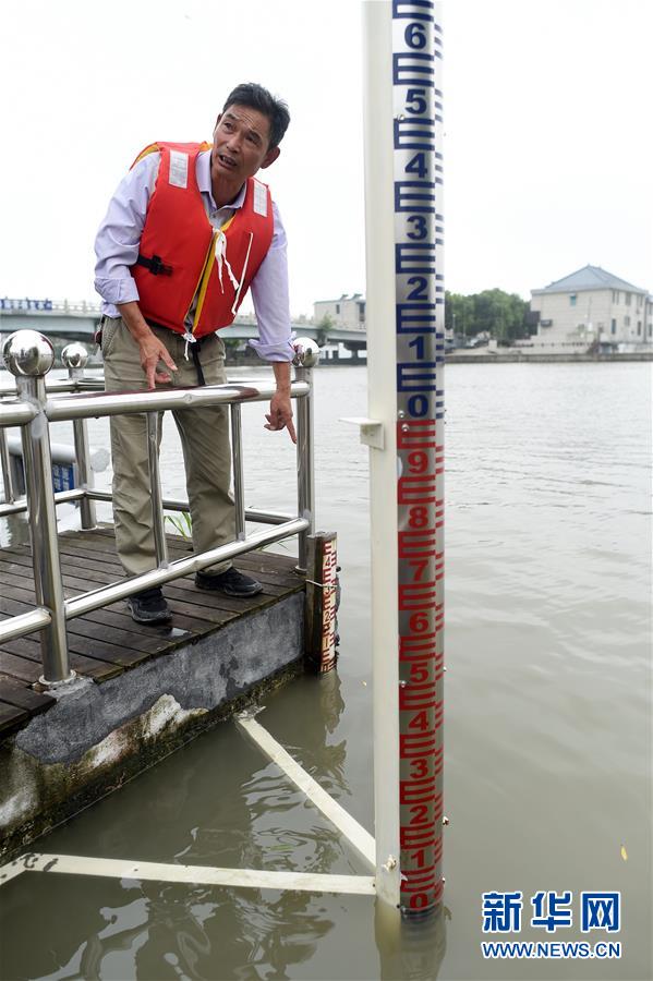 7月17日,王江涇水文站工作人員介紹京杭大運(yùn)河水位情況。浙江省嘉興市秀洲區(qū)處在杭嘉湖平原,受持續(xù)強(qiáng)降雨及上游排水影響,近期,秀洲區(qū)境內(nèi)的京杭大運(yùn)河分支航道持續(xù)保持較高水位。當(dāng)?shù)叵嚓P(guān)部門(mén)嚴(yán)陣以待,落實(shí)各項(xiàng)措施,確保安全度汛。新華社記者韓傳號(hào)攝