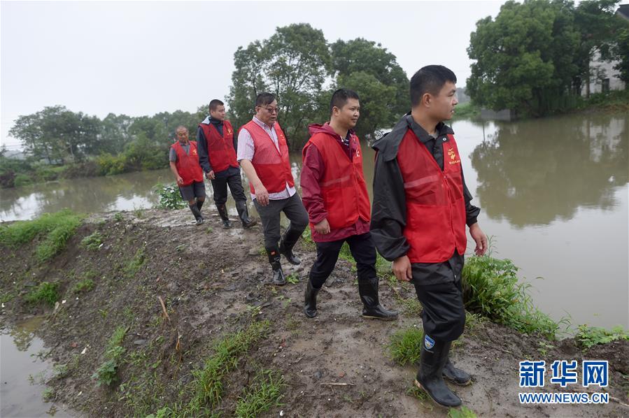 7月17日,基層網(wǎng)格員和志愿者在秀洲區(qū)新塍鎮(zhèn)小金港村的河道邊巡河。浙江省嘉興市秀洲區(qū)處在杭嘉湖平原,受持續(xù)強(qiáng)降雨及上游排水影響,近期,秀洲區(qū)境內(nèi)的京杭大運(yùn)河分支航道持續(xù)保持較高水位。當(dāng)?shù)叵嚓P(guān)部門(mén)嚴(yán)陣以待,落實(shí)各項(xiàng)措施,確保安全度汛。新華社記者韓傳號(hào)攝