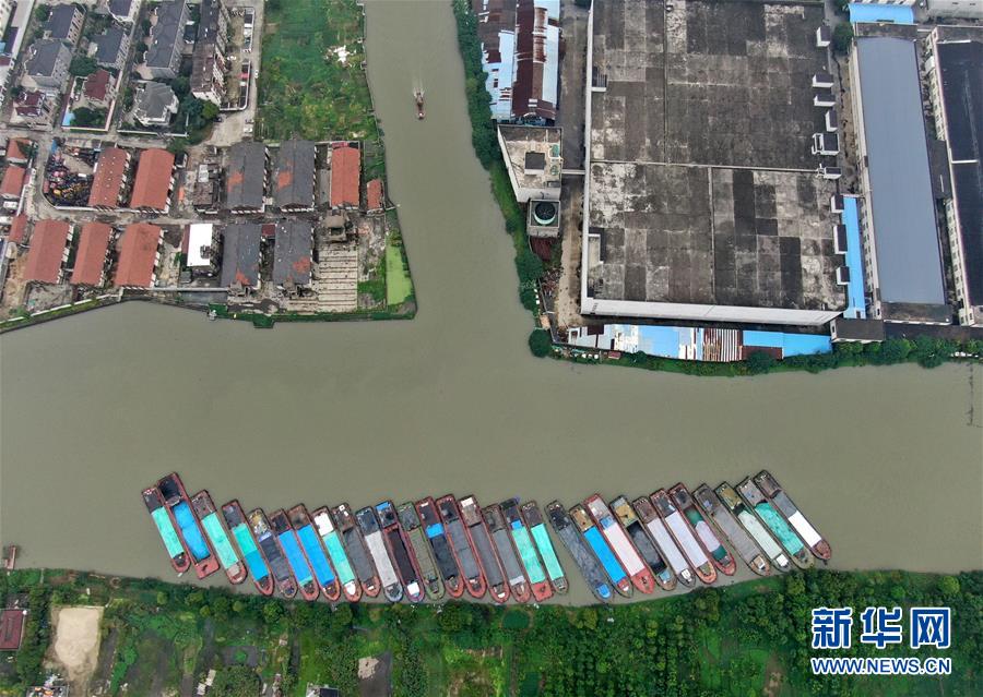 7月17日拍攝的秀洲區(qū)王江涇鎮(zhèn)境內(nèi)京杭大運(yùn)河邊臨時(shí)停靠的船舶(無(wú)人機(jī)照片)。浙江省嘉興市秀洲區(qū)處在杭嘉湖平原的低洼地帶,受持續(xù)強(qiáng)降雨及上游排水影響,秀洲區(qū)境內(nèi)的京杭大運(yùn)河分支航道持續(xù)保持較高水位。為確保安全度汛,秀洲區(qū)相關(guān)部門(mén)全力以赴做好防汛各項(xiàng)工作。新華社記者韓傳號(hào)攝