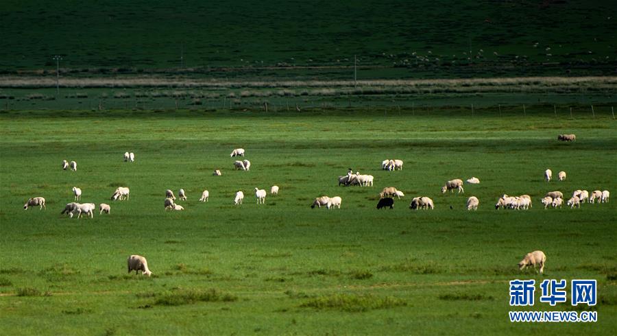 7月18日,羊群在內蒙古錫林郭勒盟正鑲白旗境內的草原上覓食。連日來,內蒙古錫林郭勒盟迎來多次降雨,境內廣袤的草原經過雨水的滋潤,煥發(fā)出勃勃生機。新華社記者連振攝