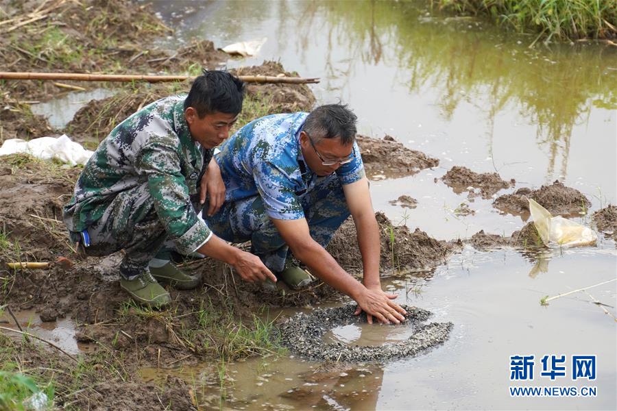 劉良武(右)與巡查人員在堤壩內(nèi)側(cè)處理一處泡泉(7月19日攝)。新華社記者張浩波攝