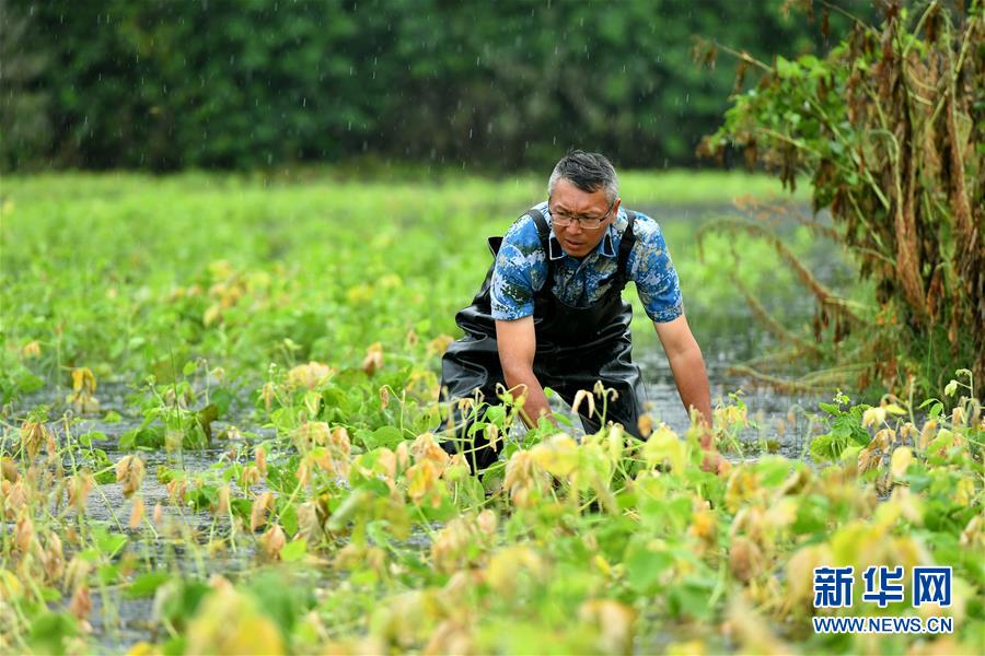 劉良武在堤壩內(nèi)側(cè)積水處排查泡泉(7月19日攝)。新華社記者李鑫攝
