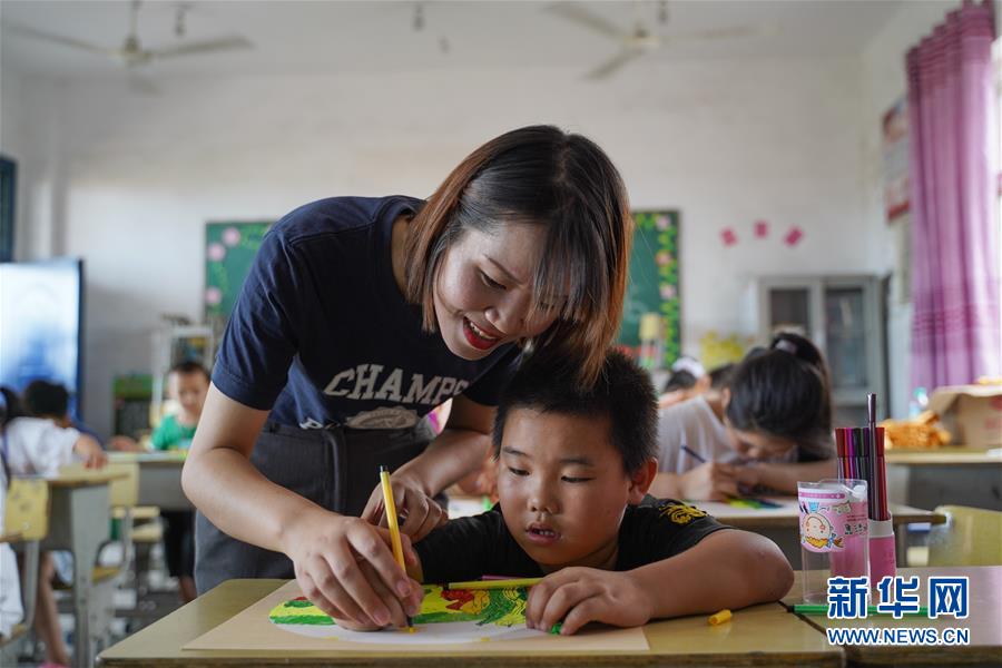 7月23日,在廬山市蛟塘鎮(zhèn)中心小學安置點,一名老師在指導孩子繪畫。新華社記者張浩波攝