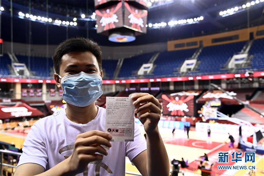 7月26日,在青島國信體育館,蘇柯帆展示著自己的紙質球票。他成為CBA聯(lián)賽復賽允許觀眾現(xiàn)場觀賽后,首位進場的觀眾。當日,在山東青島舉行的2019-2020賽季中國男子籃球職業(yè)聯(lián)賽(CBA)復賽第二階段(嶗山賽區(qū))比賽中,醫(yī)護人員、教師、公安戰(zhàn)線人士通過官方購票平臺,完成包括核酸檢測在內的相關流程后進場觀看了上海久事隊迎戰(zhàn)山東西王隊的比賽。觀賽期間,觀賽者須全程佩戴口罩,對號入座,嚴格保持間隔一米就座。退場時,觀眾須按照自后向前、先兩邊后中間的順序,保持“一米線”社交距離有序退場。新華社記者 郭緒雷 攝