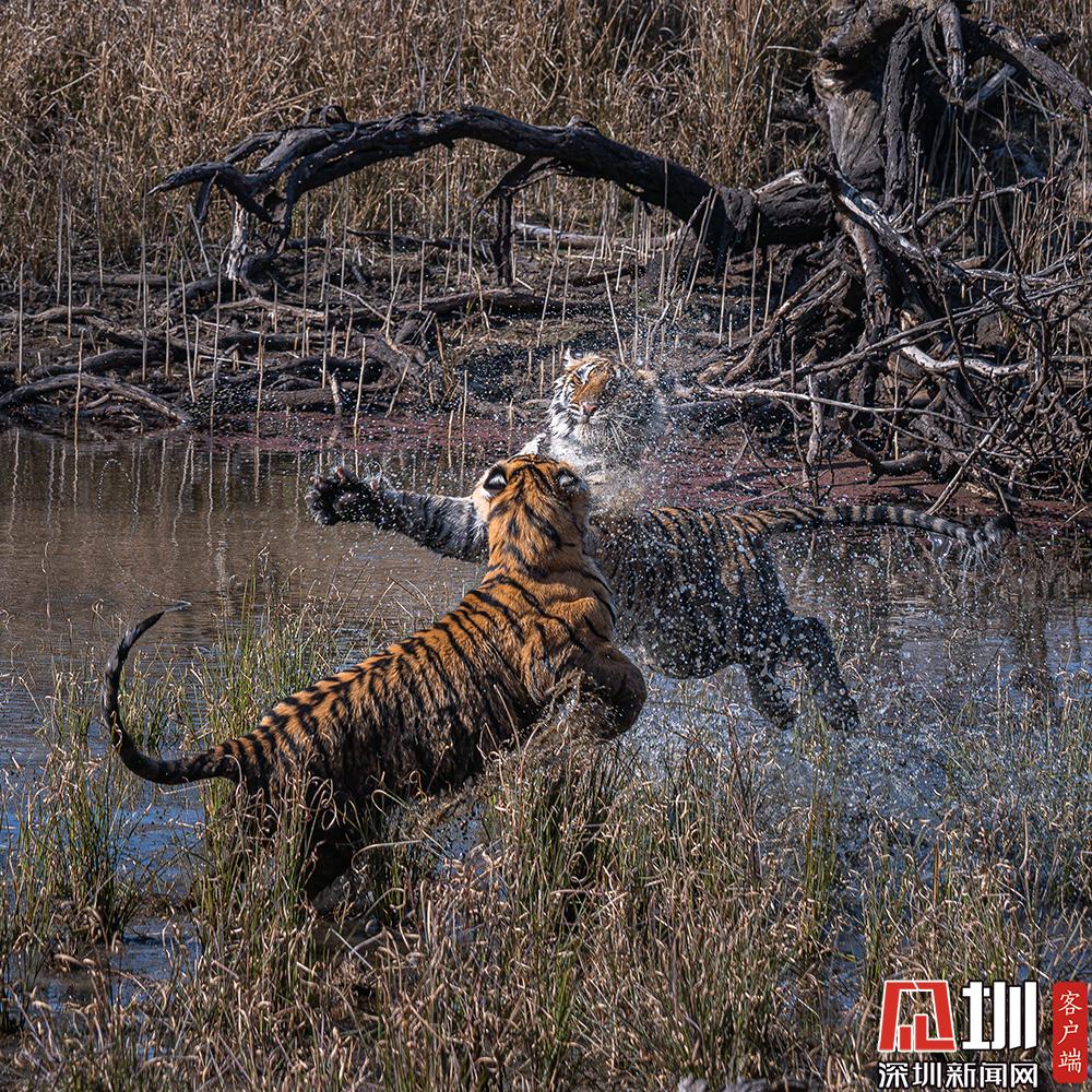 2020年7月27日,猛虎斗有多壯觀?來自印度德里的41歲職業(yè)業(yè)攝影師Nitish Madan,在在印度北部倫滕波爾國家公園游覽時(shí),見證了兩只老虎幼崽激烈的水上爭奪戰(zhàn)。從畫面中可以看到,兩只足足有200磅重的孟加拉虎,面對面互相咆哮,伸出虎爪兇猛至極,才15個(gè)月大就已經(jīng)有了王者風(fēng)范。