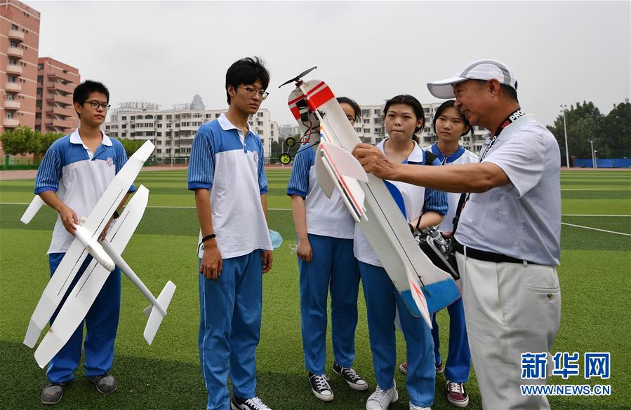 7月27日,老師在天津中學(xué)操場上給參加暑期實踐營的學(xué)生講解航模知識。新華社記者 李然 攝