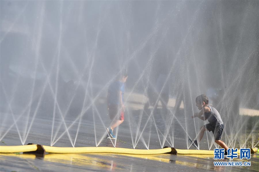 7月28日,在奧地利維也納,兒童在一處廣場戲水。新華社記者郭晨攝